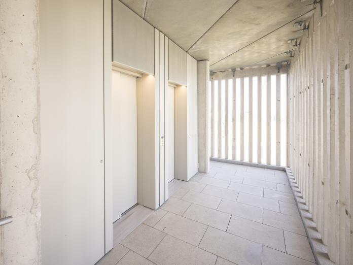 En coherencia con este planteamiento, el diseño de los ascensores de Orona se integra de forma natural en la arquitectura del edificio, respetando su materialidad y su lógica ambiental. La movilidad vertical se entiende así como un elemento más del sistema de confort y sostenibilidad del conjunto, aportando funcionalidad sin interferir en la calidad espacial de los espacios comunes.